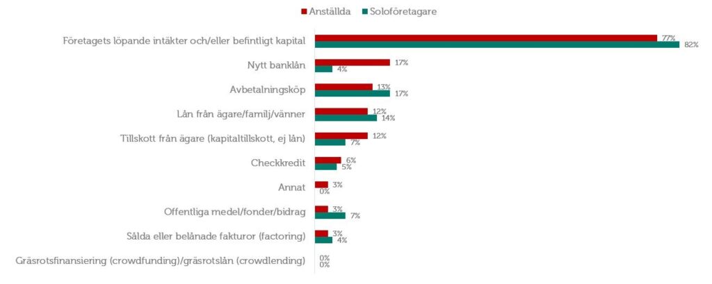 Lån från ägare/familj är även vanligare än vad många tror. Nedan visas statistik från Företagarna när de i en undersökning ställde frågan ”På vilket sätt finansierade företaget investeringar senaste 12 månaderna?”.